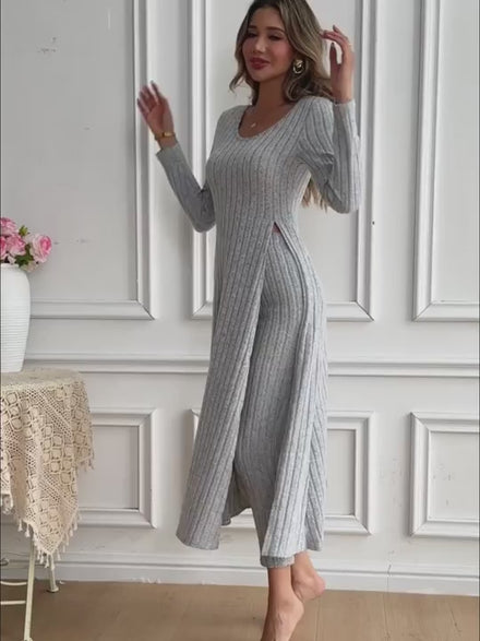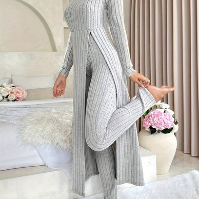 Dieses zweiteilige Set besteht aus einem langärmligen Top mit Rundhalsausschnitt und dezentem Schlitzdetail sowie einer dazu passenden Hose. Das Set ist aus einem weichen Material mit mittlerer Dehnbarkeit gefertigt und eignet sich für den täglichen Gebrauch in mehreren Jahreszeiten.
